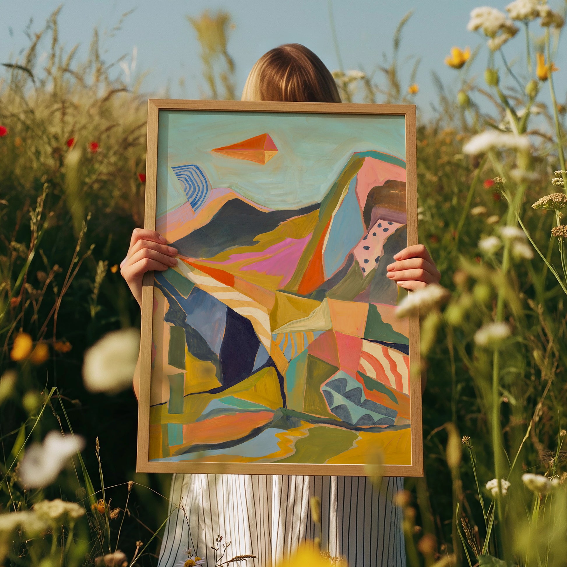 Bring vibrant retro charm to your space with this Blue Midcentury Modern Mountain Print. Featuring a colorful desert landscape, this artwork adds a warm, boho touch to any room.