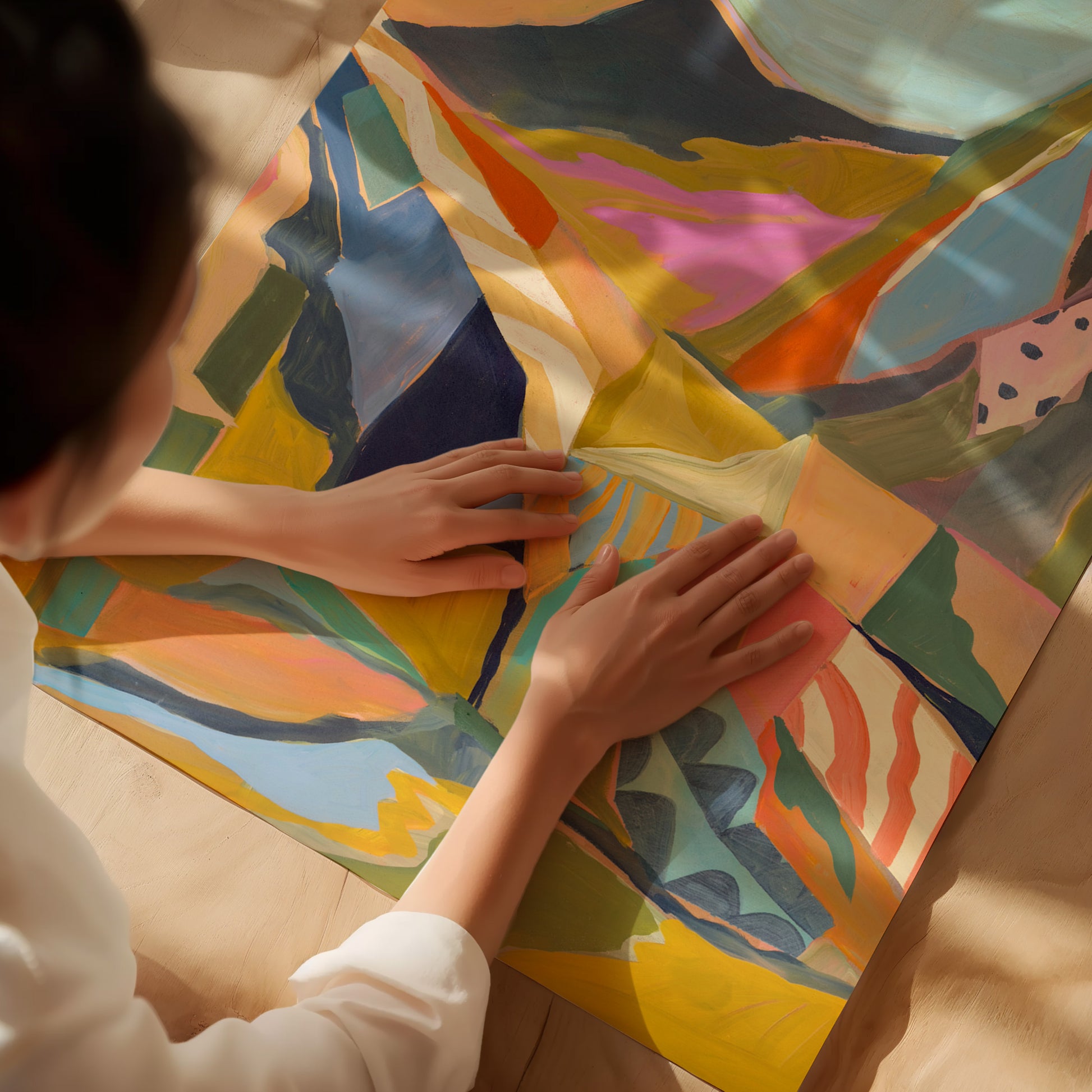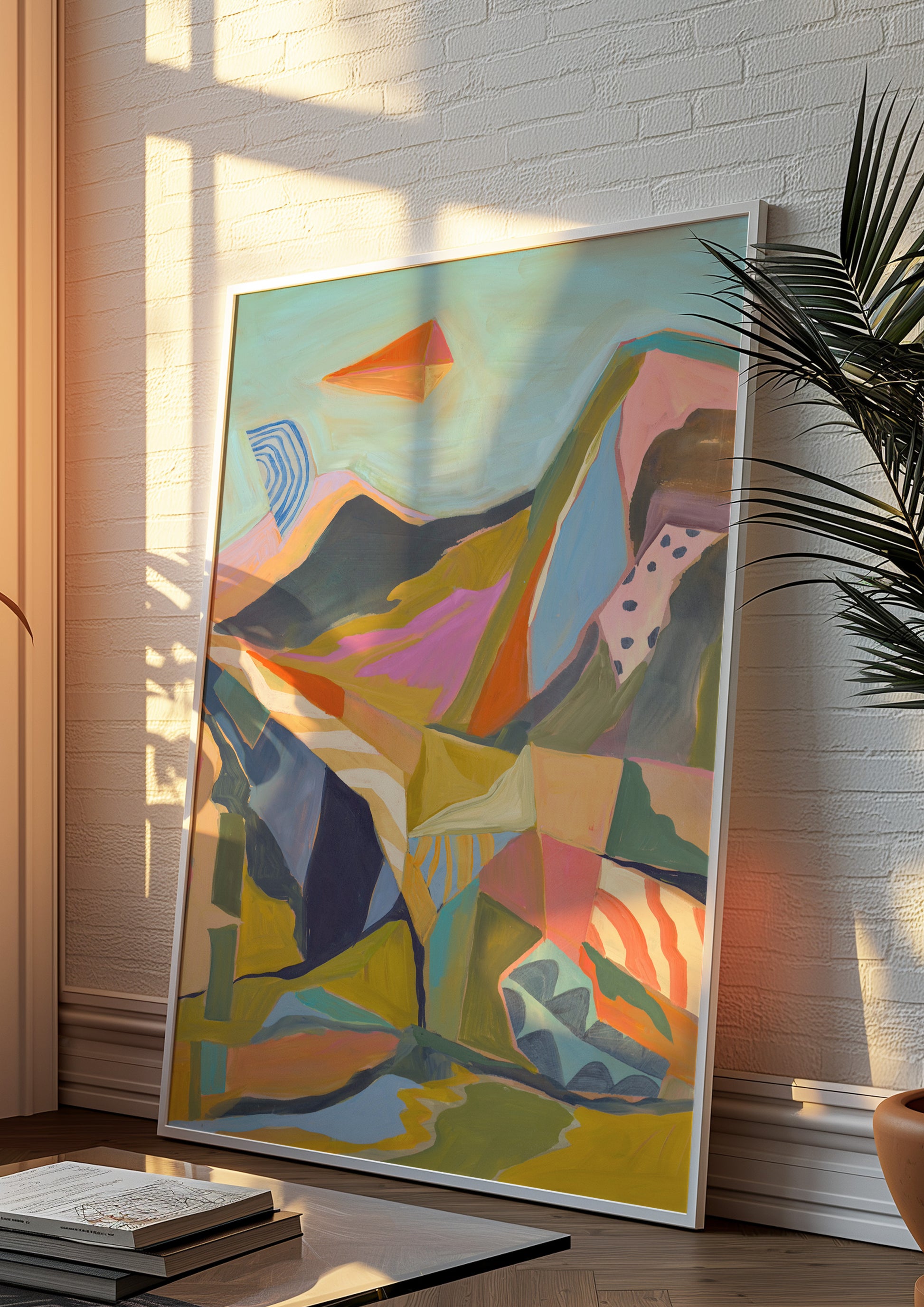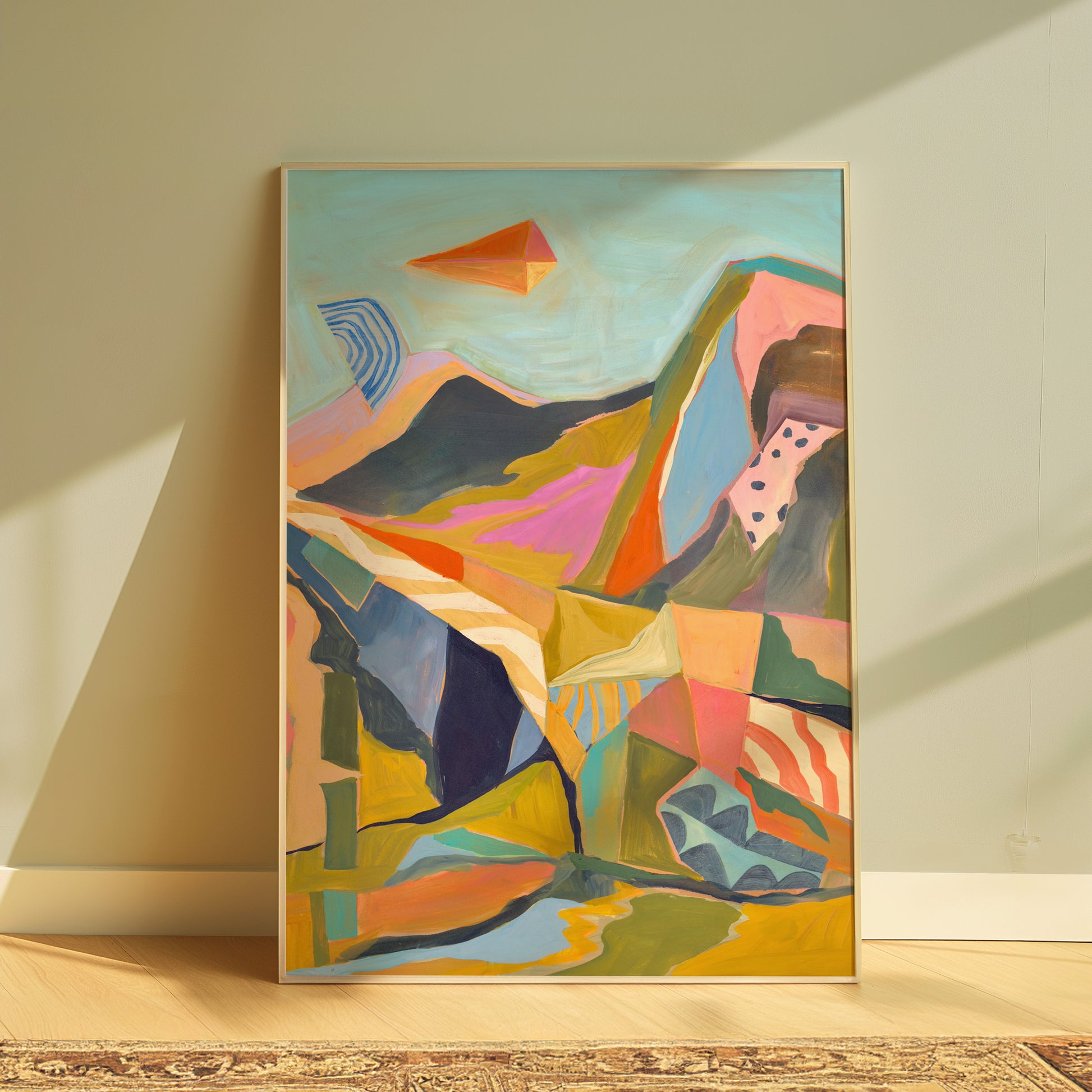 Bring vibrant retro charm to your space with this Blue Midcentury Modern Mountain Print. Featuring a colorful desert landscape, this artwork adds a warm, boho touch to any room.