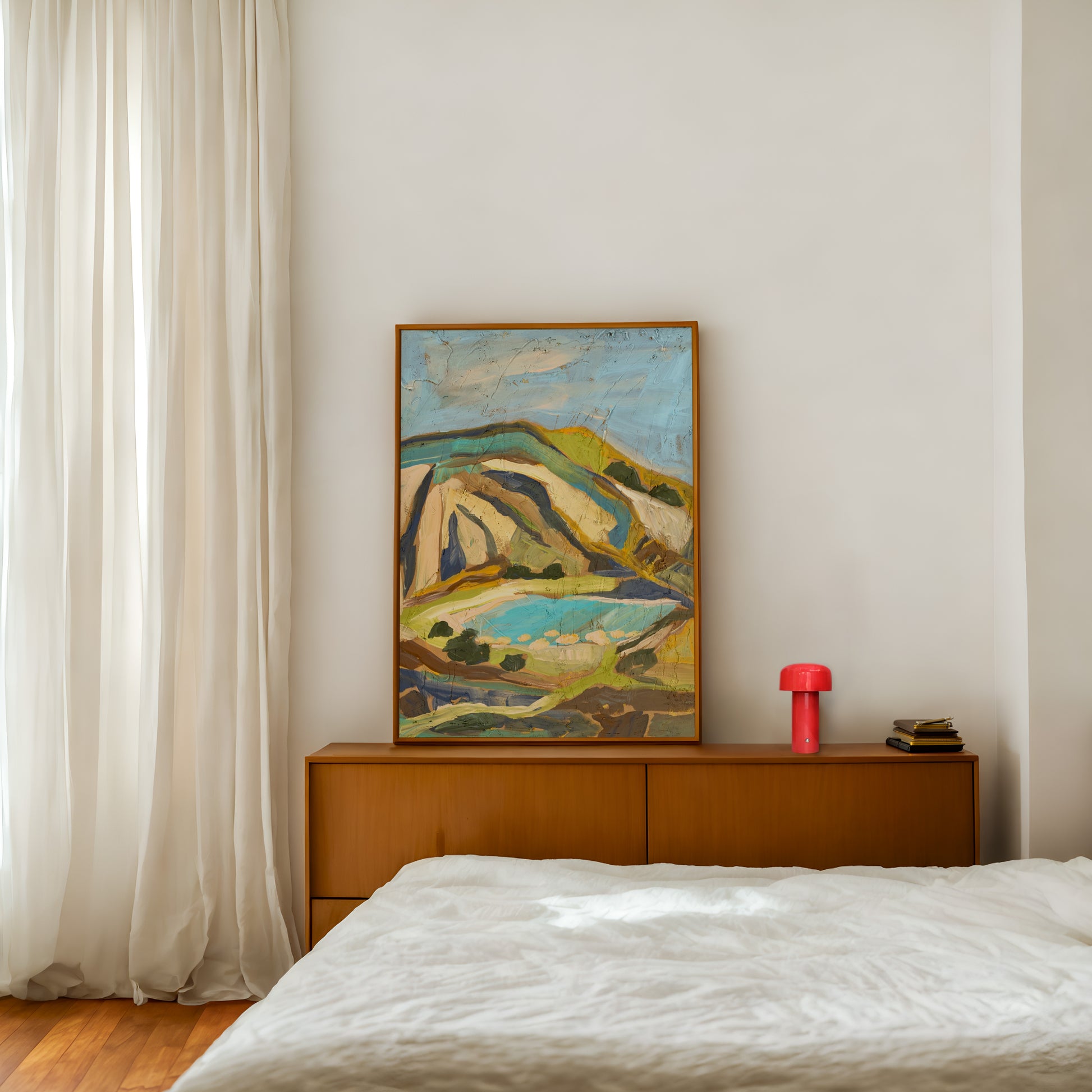 Bring the calm and beauty of California nature into your home with this Neutral Pastel Minimalist Desert Mountain Landscape. This abstract painting captures the essence of the desert with a modern twist, making it the perfect addition to any boho or nature-inspired decor.
