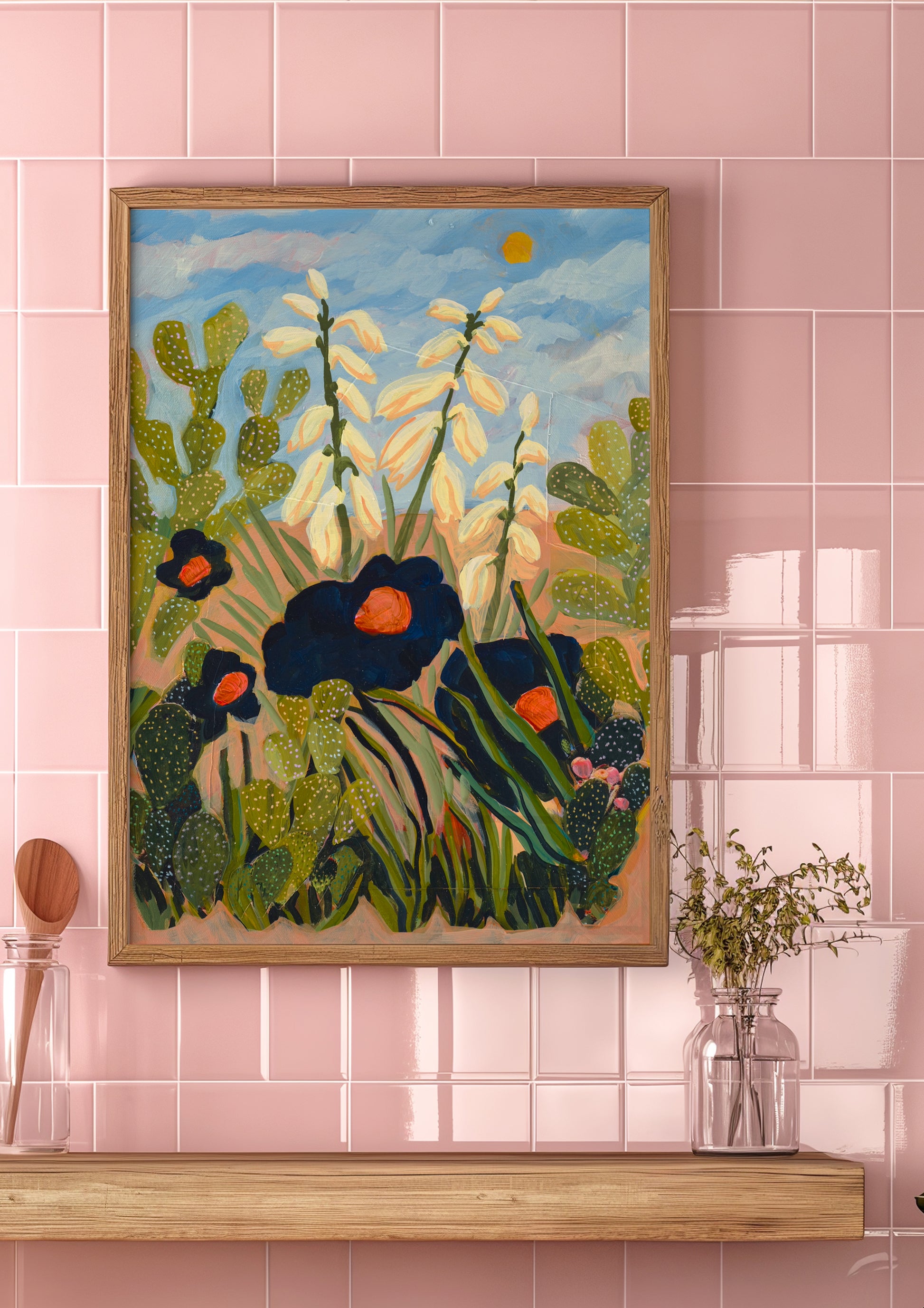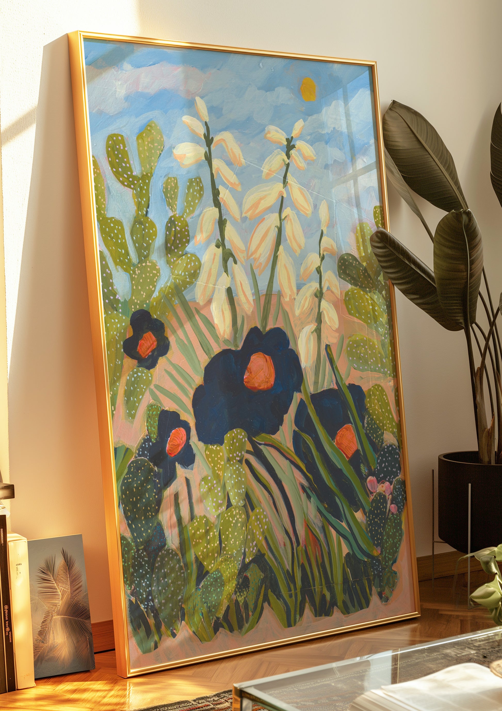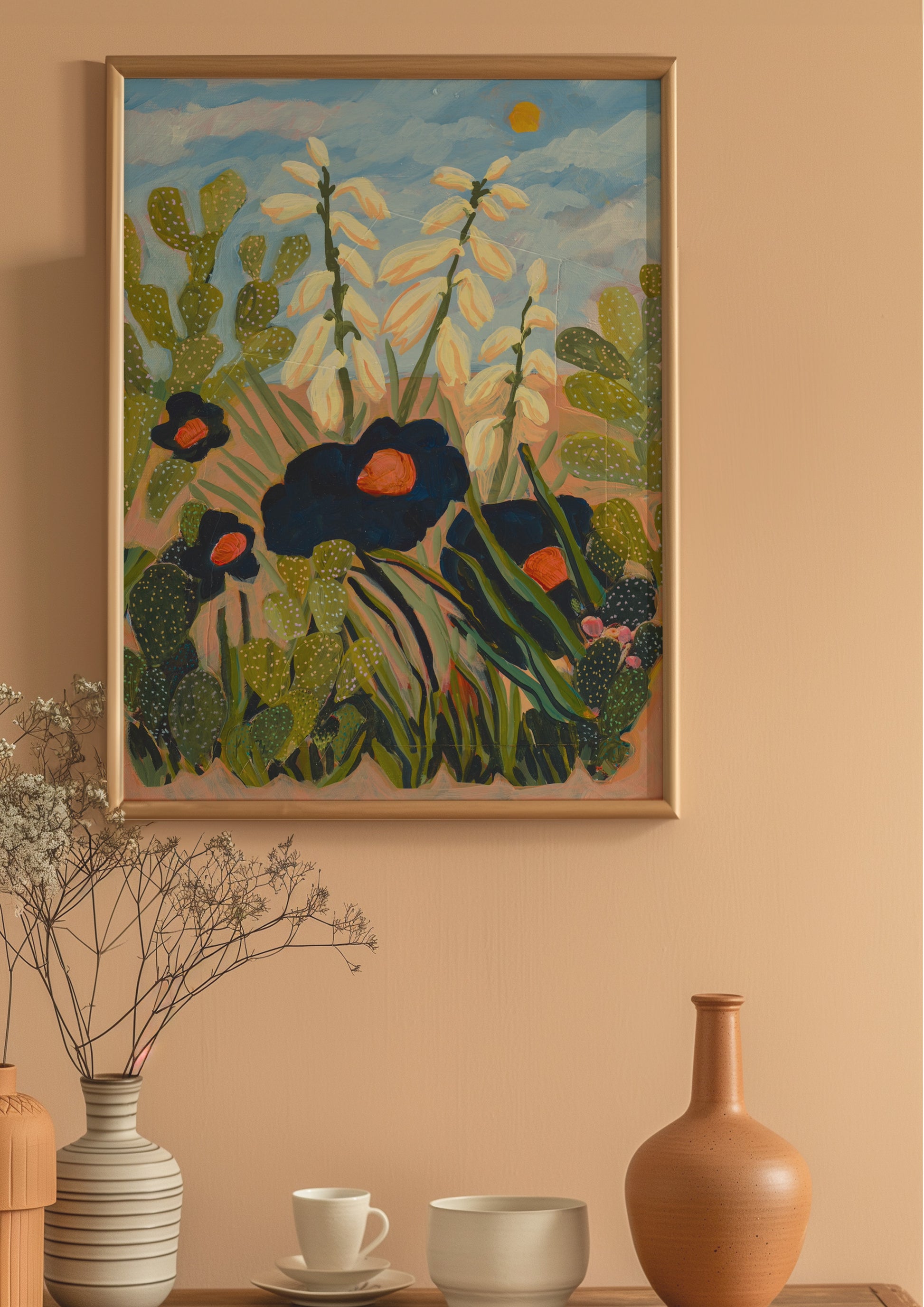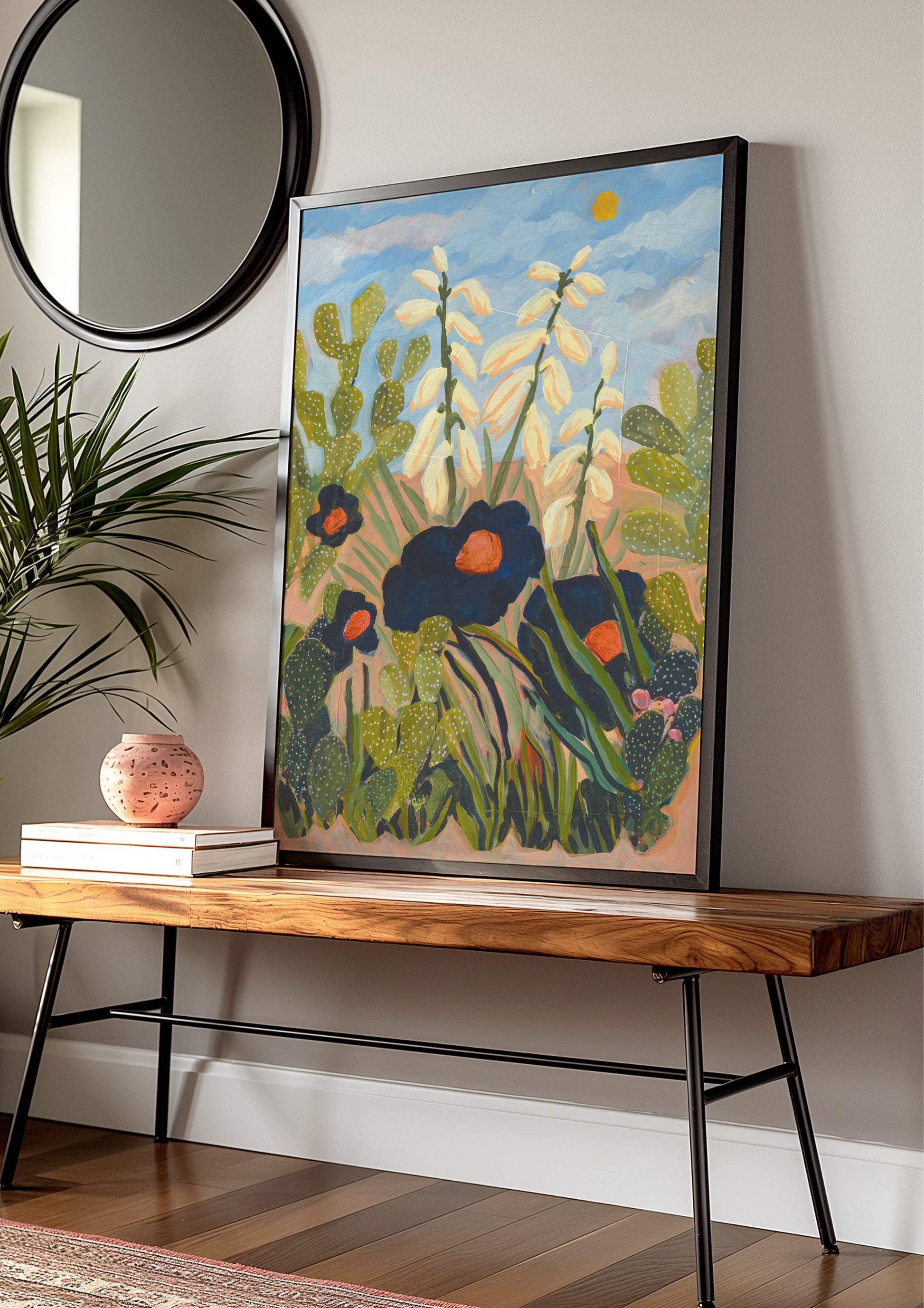 Celebrate the serene beauty of the Southwest with this Desert Floral Print, featuring detailed paintings of the yucca plant and prickly pear cactus. This nature-inspired artwork brings a calming boho vibe to any space, perfect for creating a warm, inviting atmosphere.