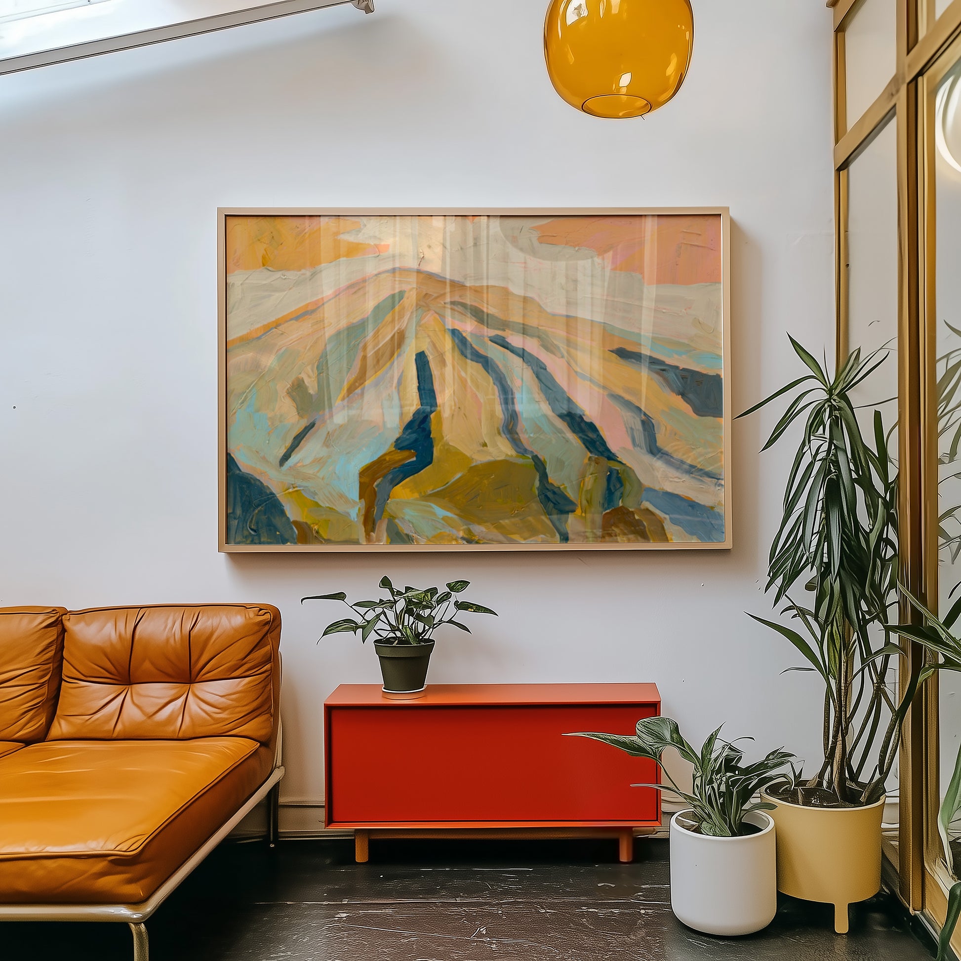 Enhance your home decor with this stunning Neutral Abstract Mountain Landscape Wall Art Print. The modern and minimal design features a beautiful peach desert southwest landscape, adding a touch of contemporary nature to any room.