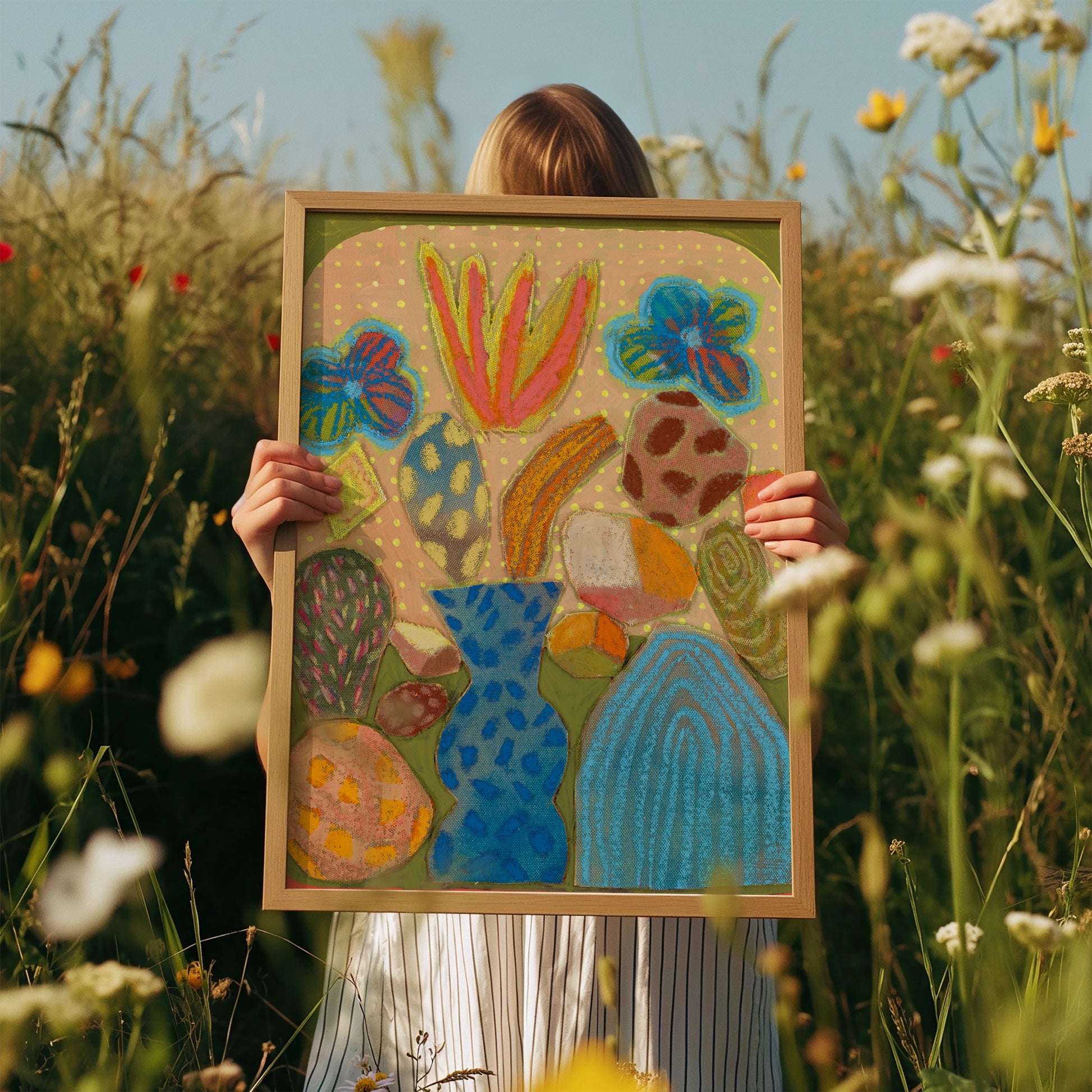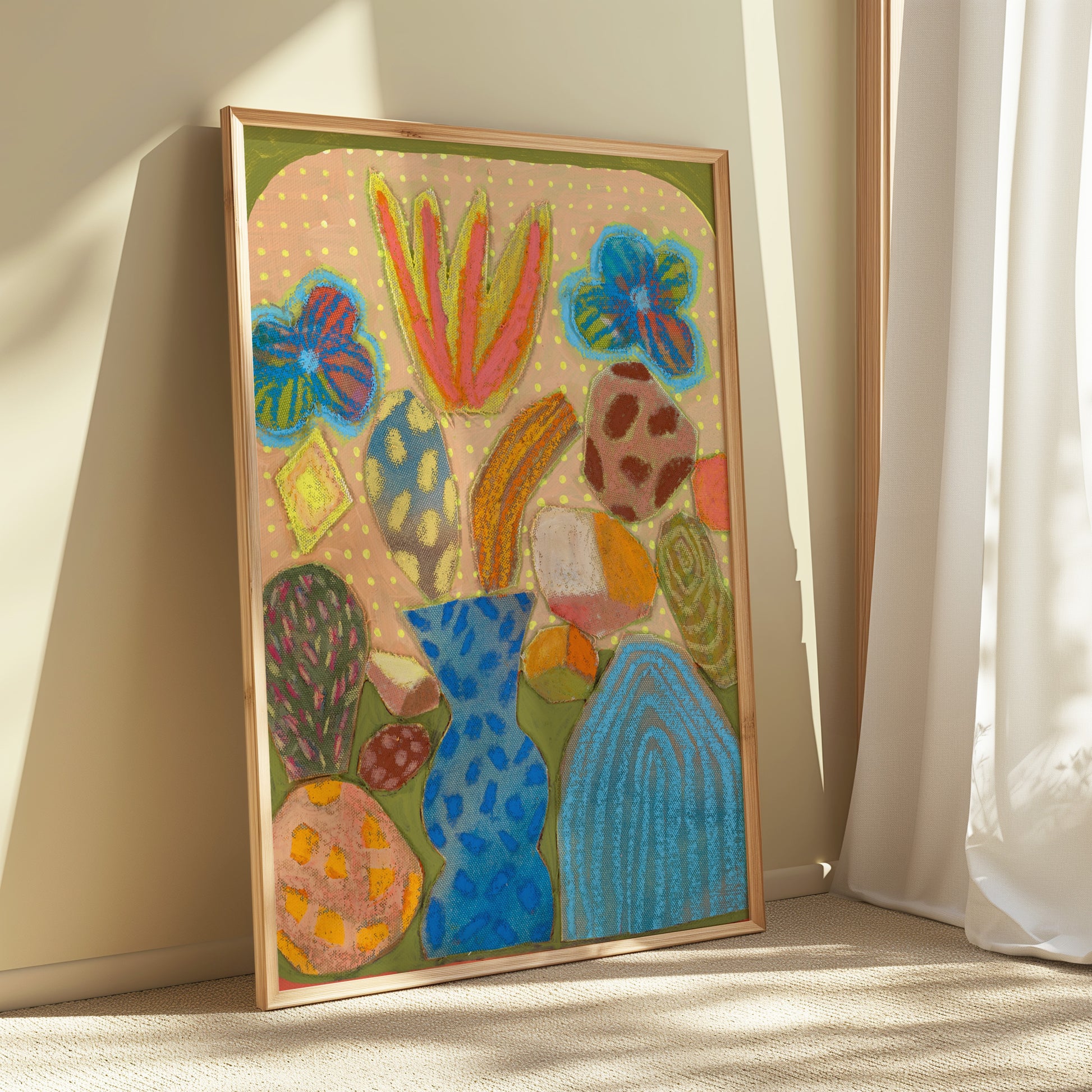 Celebrate the vibrant spirit of the Southwest with this Rock Prickly Pear Cactus Poster. Featuring colorful abstract art in a midcentury modern style, this print brings a warm, boho desert vibe to your space.