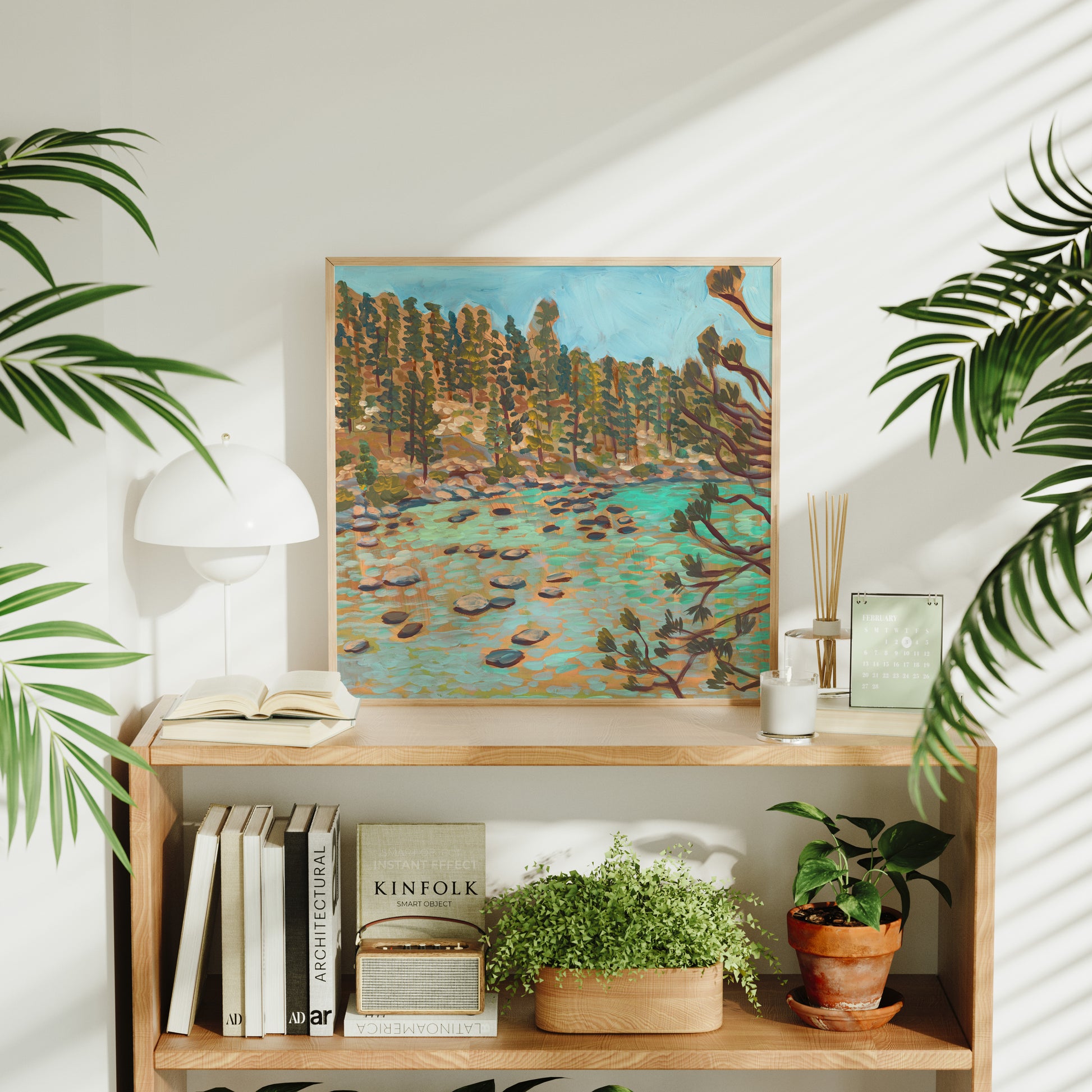 Discover the beauty of Lake Tahoe with this California travel poster. This midcentury modern western original painting is perfect for large walls, adding a touch of retro charm to any space.